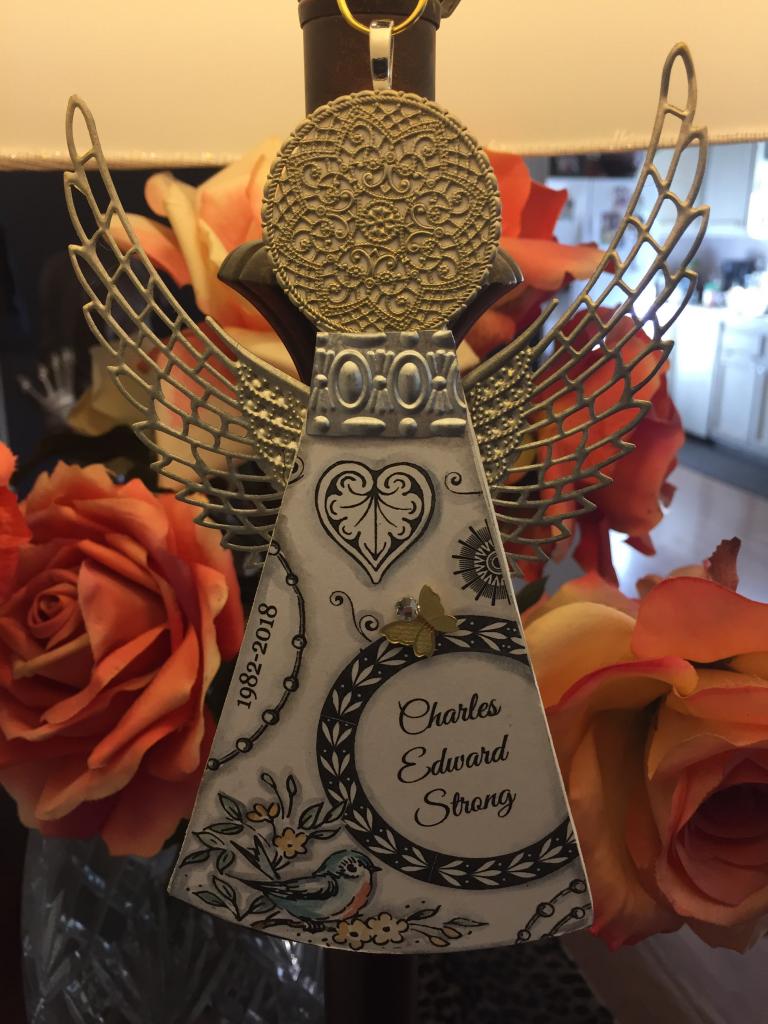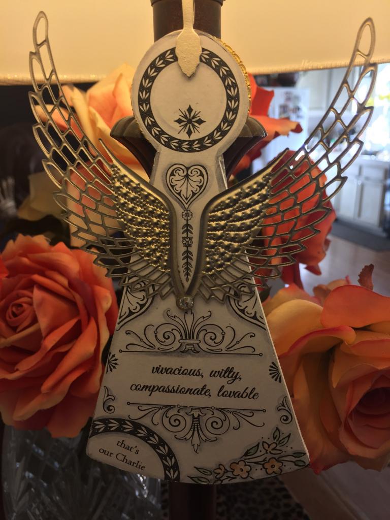 CHARLIE'S ANGEL ---------- Miscellaneous Made of wood and metal, and hand detailed with watercolors and embellishments. Front displays up to 5 words including dates, back displays up to 10 words of your chosing.Angel is 7" tall.