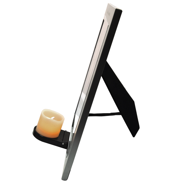 "The First Memorial Photo Frame With Flip Down Votive Holder" The Eternal Frame is an elegant, brushed metal memorial picture frame that honors a lost loved one, such as a family member, friend or pet. The Eternal Frame holds an 8 x 10 photo; has a high grade acrylic glazing (same as museums use for expensive paintings); features a flip down led votive candle holder; and comes with a 2" led votive candle.Honors your loved one with the words "Always Remembered, Forever Loved". The Eternal Frame can be placed on a tabletop, shelf or hung on a wall. The loss of a loved one is always the most heartbreaking experience we will ever face in life. A picture of a lost loved one is too important to put in a standard, impersonal photo frame. You can keep their memory and spirit alive with the Eternal Frame. The Eternal Frame is a beautiful tribute to the dearly departed. Just turn on the votive candle and allow the warm, soft glow to light up the picture of your loved one; and you will be filled with a sense of peace and joy knowing that their spirit and memory lives on.
