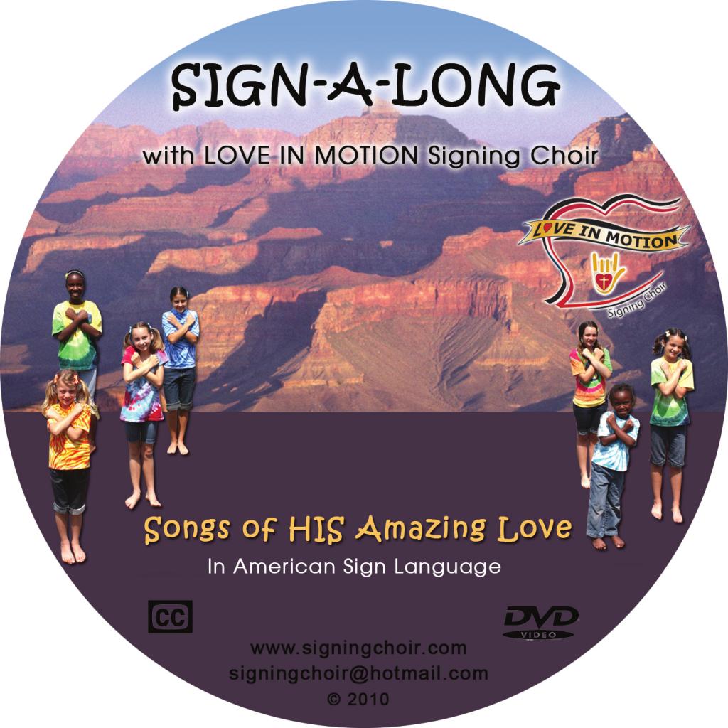 Sign-A-Long With Love In Motion Signing Choir: Songs Of His Amazing Love ---------- DVDs Books, CDs & DVDs We traveled to four states - Oregon, Colorado, California, and Arizona to film 10 songs of God’s AMAZING love in God’s AMAZINGLY scenic locations. Sign along with other signers aged 6 to 76 as we all enjoy lifting our hands to HIM.Testify to LoveTalk About ItLove One AnotherLove SongAmazing GraceJesus Loves the Little ChildrenPower of Your LoveYou Are My KingHow Great Thou ArtAmazing Love